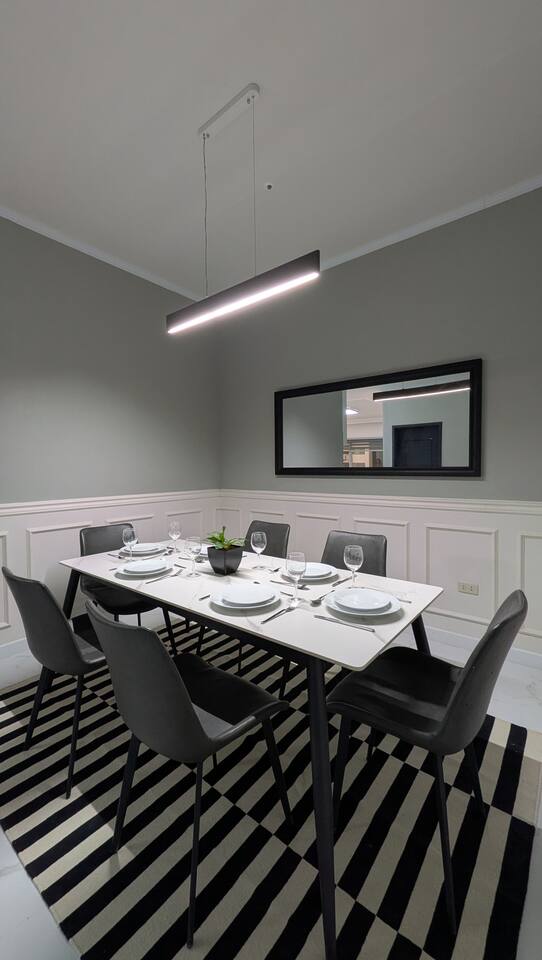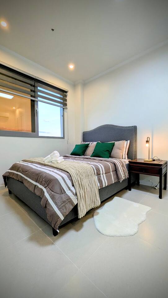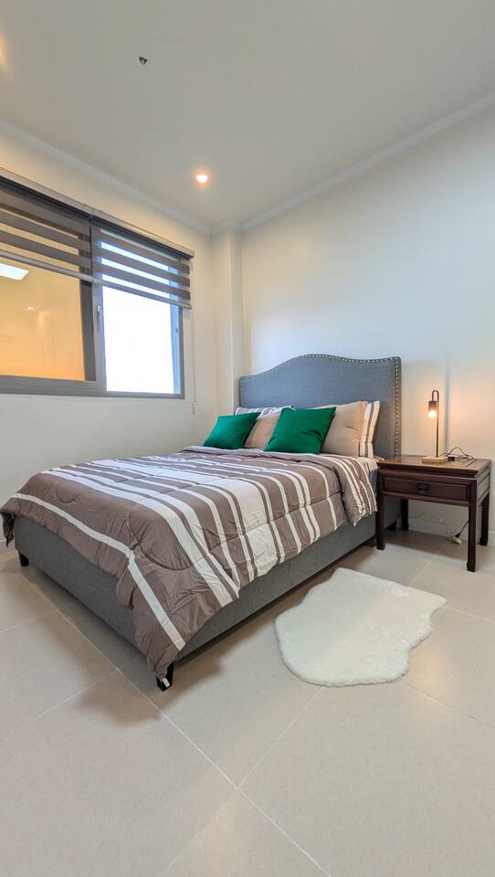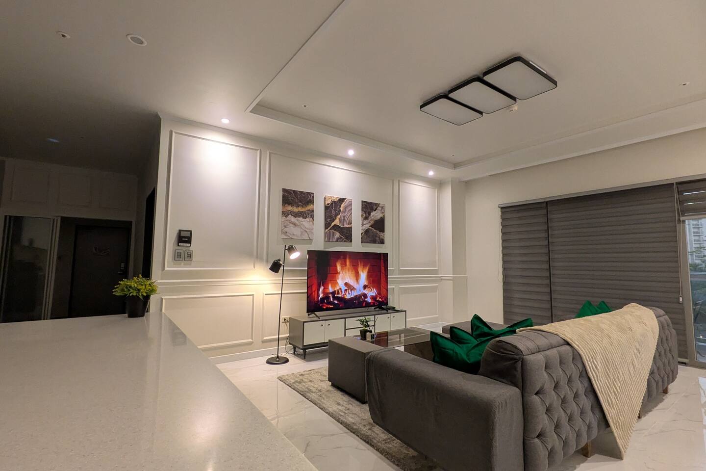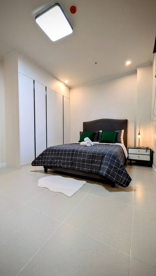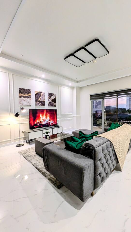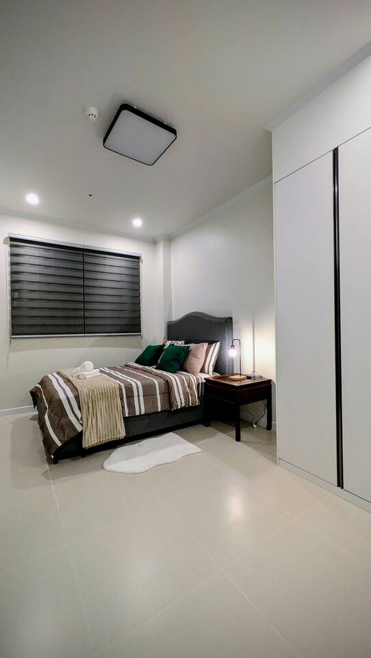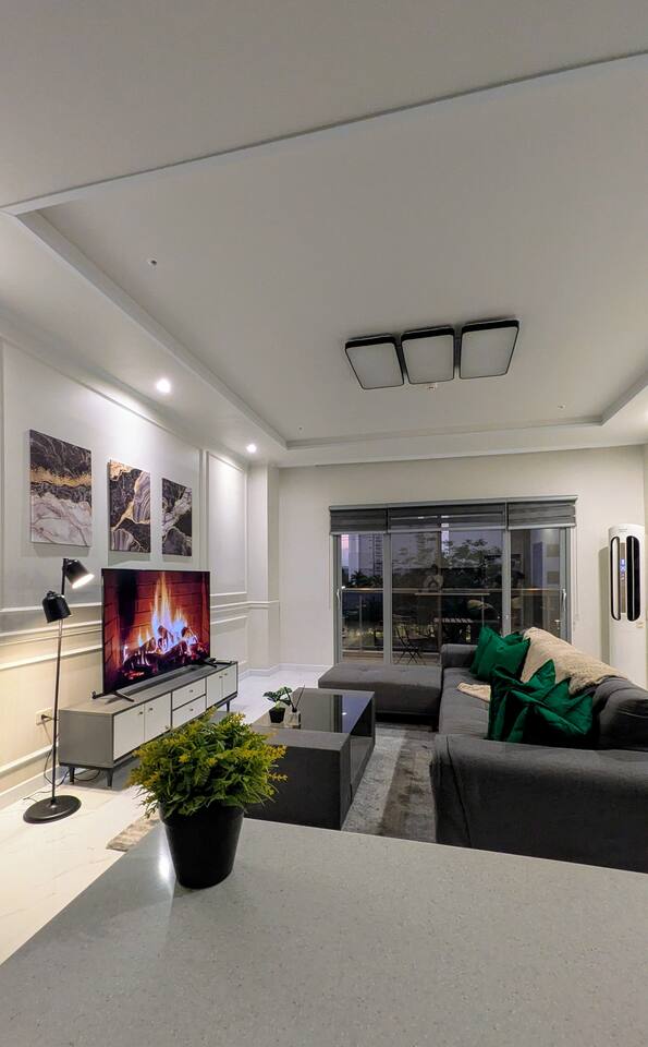 This modern condominium in Clark Freeport Zone offers a spacious and comfortable layout designed for both relaxation and convenience. The living area features high ceilings, comfortable seating, and a large smart TV, creating a bright and inviting space where guests can relax, watch movies, or spend time together. The kitchen and dining area are fully equipped for preparing and enjoying meals during your stay. Guests will find essential appliances, cookware, and dining space suitable for small groups or families. The unit includes three private bedrooms, each designed for comfort and rest with quality beds, clean linens, and storage space for personal belongings. There are three bathrooms, providing added convenience and privacy for groups staying together. A private balcony allows guests to enjoy fresh air and the surrounding views, making it a pleasant spot for morning coffee or evening relaxation. The overall space combines modern design, comfort, and functionality to provide a relaxing home base while exploring Clark and the surrounding area.