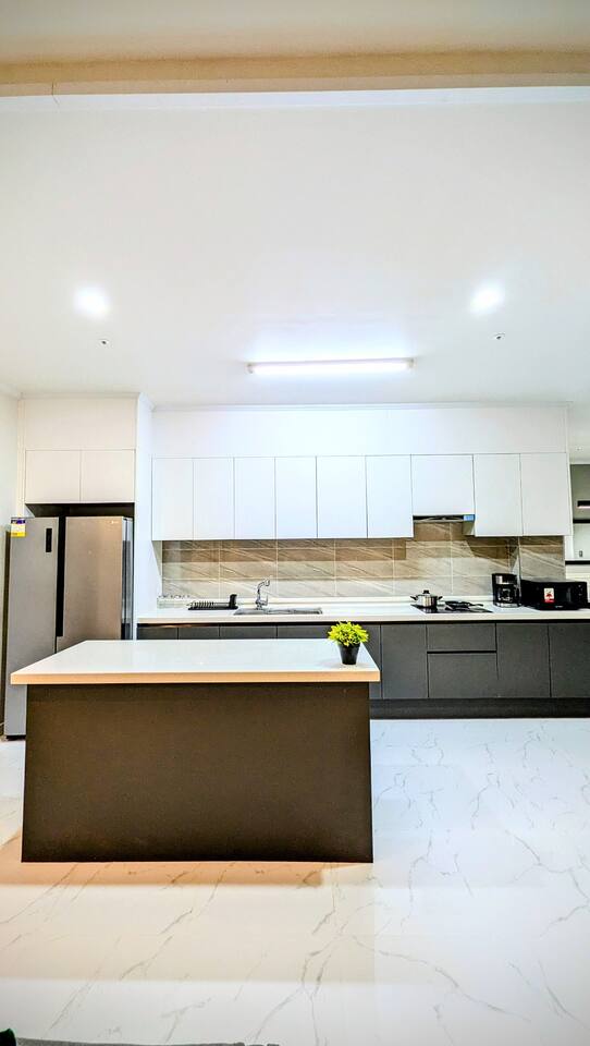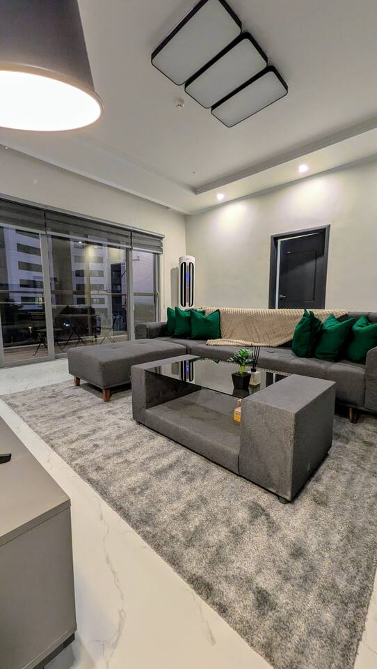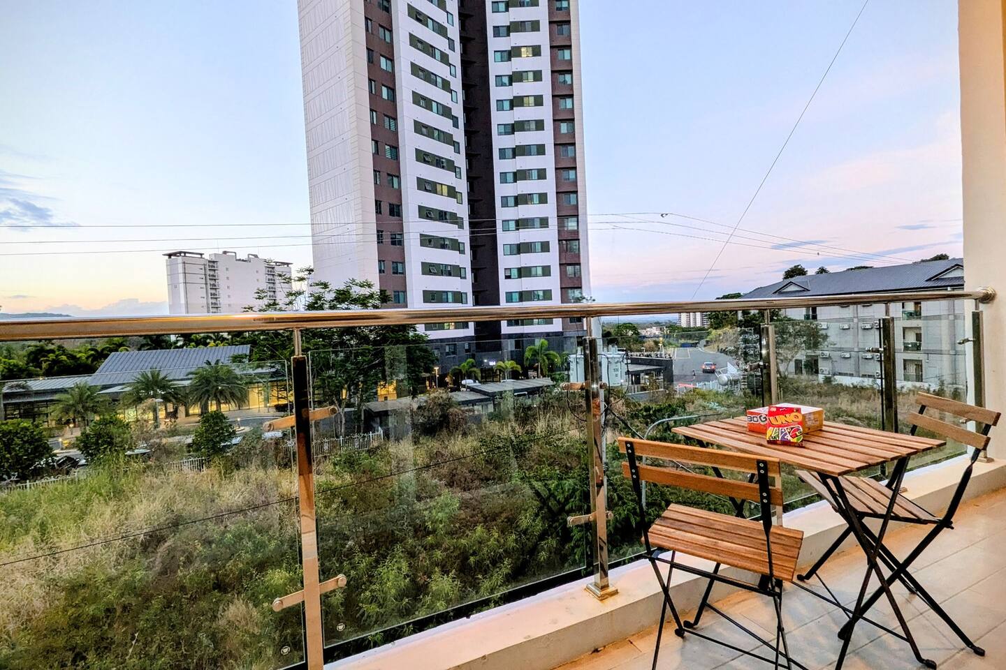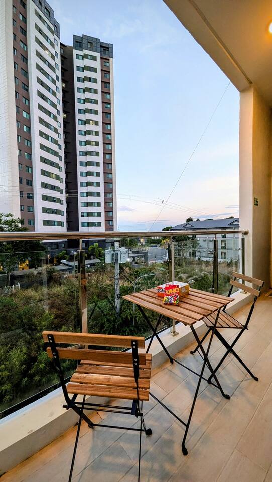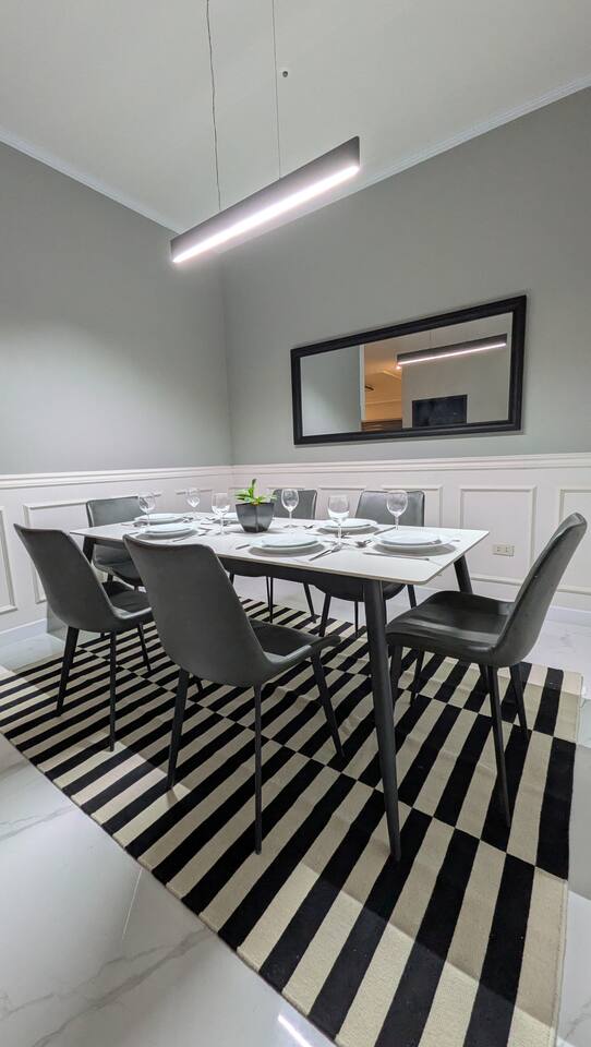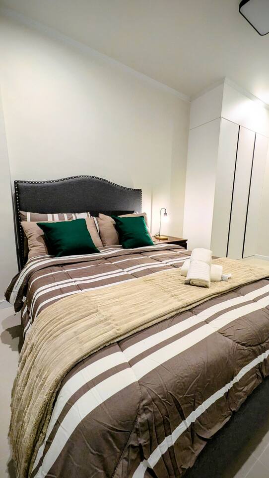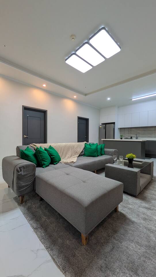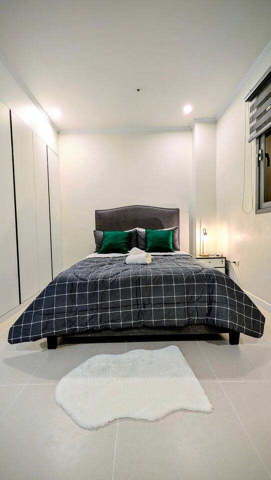 This modern condominium in Clark Freeport Zone offers a spacious and comfortable layout designed for both relaxation and convenience. The living area features high ceilings, comfortable seating, and a large smart TV, creating a bright and inviting space where guests can relax, watch movies, or spend time together. The kitchen and dining area are fully equipped for preparing and enjoying meals during your stay. Guests will find essential appliances, cookware, and dining space suitable for small groups or families. The unit includes three private bedrooms, each designed for comfort and rest with quality beds, clean linens, and storage space for personal belongings. There are three bathrooms, providing added convenience and privacy for groups staying together. A private balcony allows guests to enjoy fresh air and the surrounding views, making it a pleasant spot for morning coffee or evening relaxation. The overall space combines modern design, comfort, and functionality to provide a relaxing home base while exploring Clark and the surrounding area.
