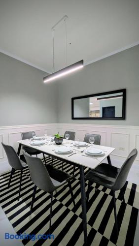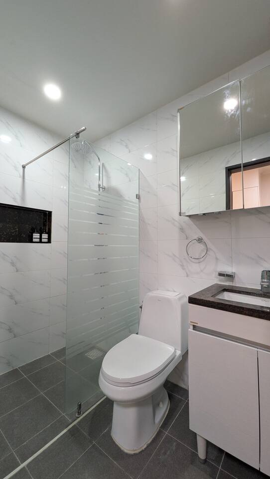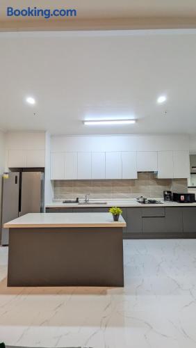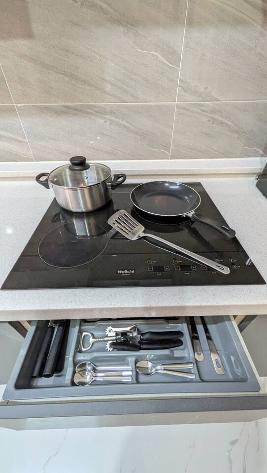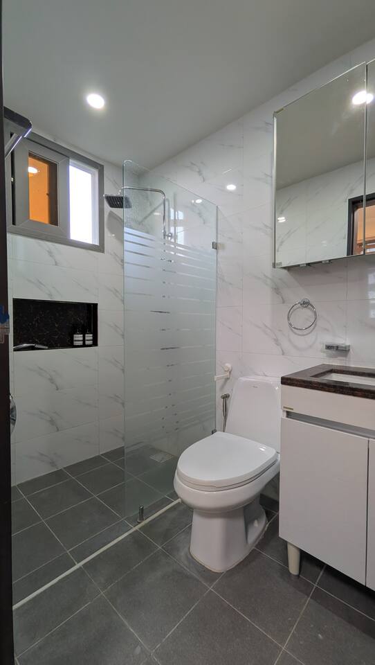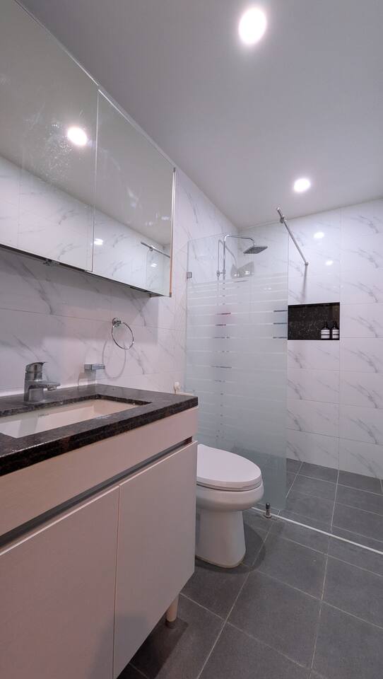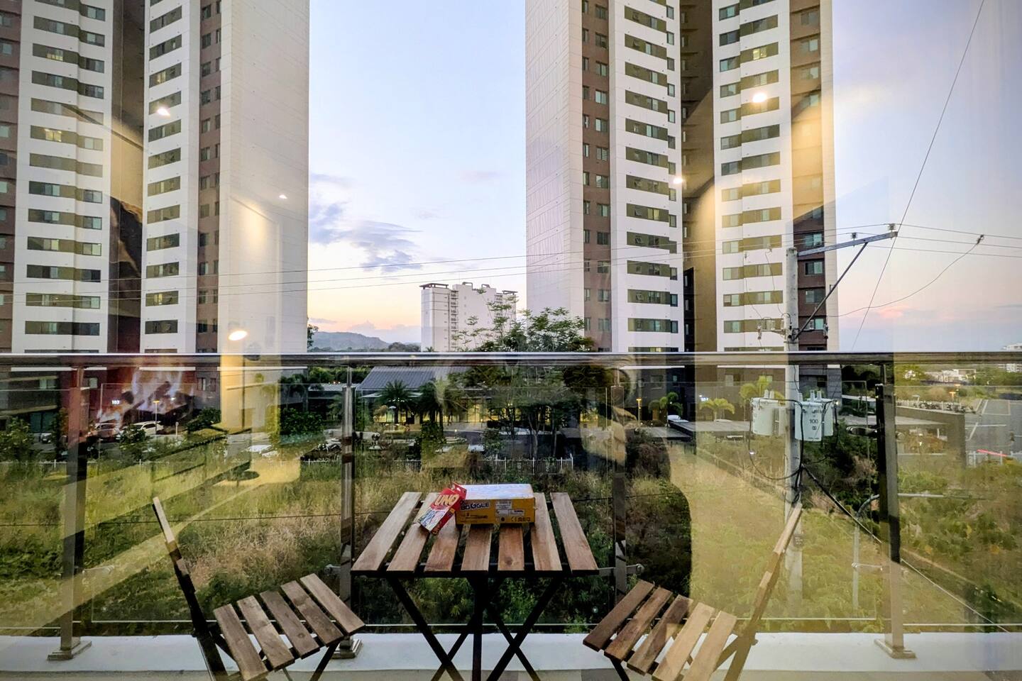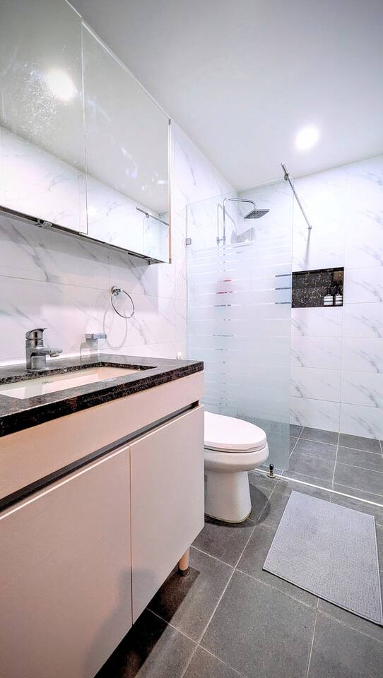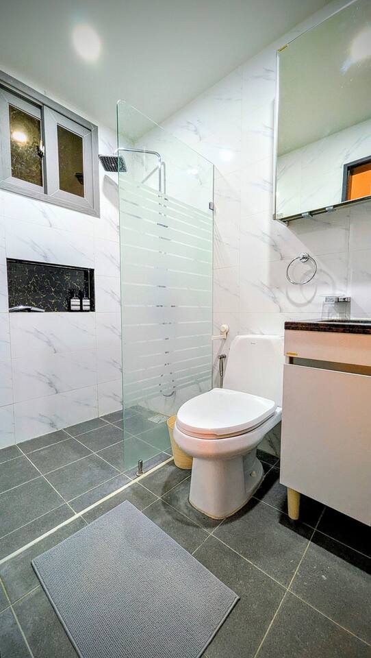 This modern condominium in Clark Freeport Zone offers a spacious and comfortable layout designed for both relaxation and convenience. The living area features high ceilings, comfortable seating, and a large smart TV, creating a bright and inviting space where guests can relax, watch movies, or spend time together. The kitchen and dining area are fully equipped for preparing and enjoying meals during your stay. Guests will find essential appliances, cookware, and dining space suitable for small groups or families. The unit includes three private bedrooms, each designed for comfort and rest with quality beds, clean linens, and storage space for personal belongings. There are three bathrooms, providing added convenience and privacy for groups staying together. A private balcony allows guests to enjoy fresh air and the surrounding views, making it a pleasant spot for morning coffee or evening relaxation. The overall space combines modern design, comfort, and functionality to provide a relaxing home base while exploring Clark and the surrounding area.
